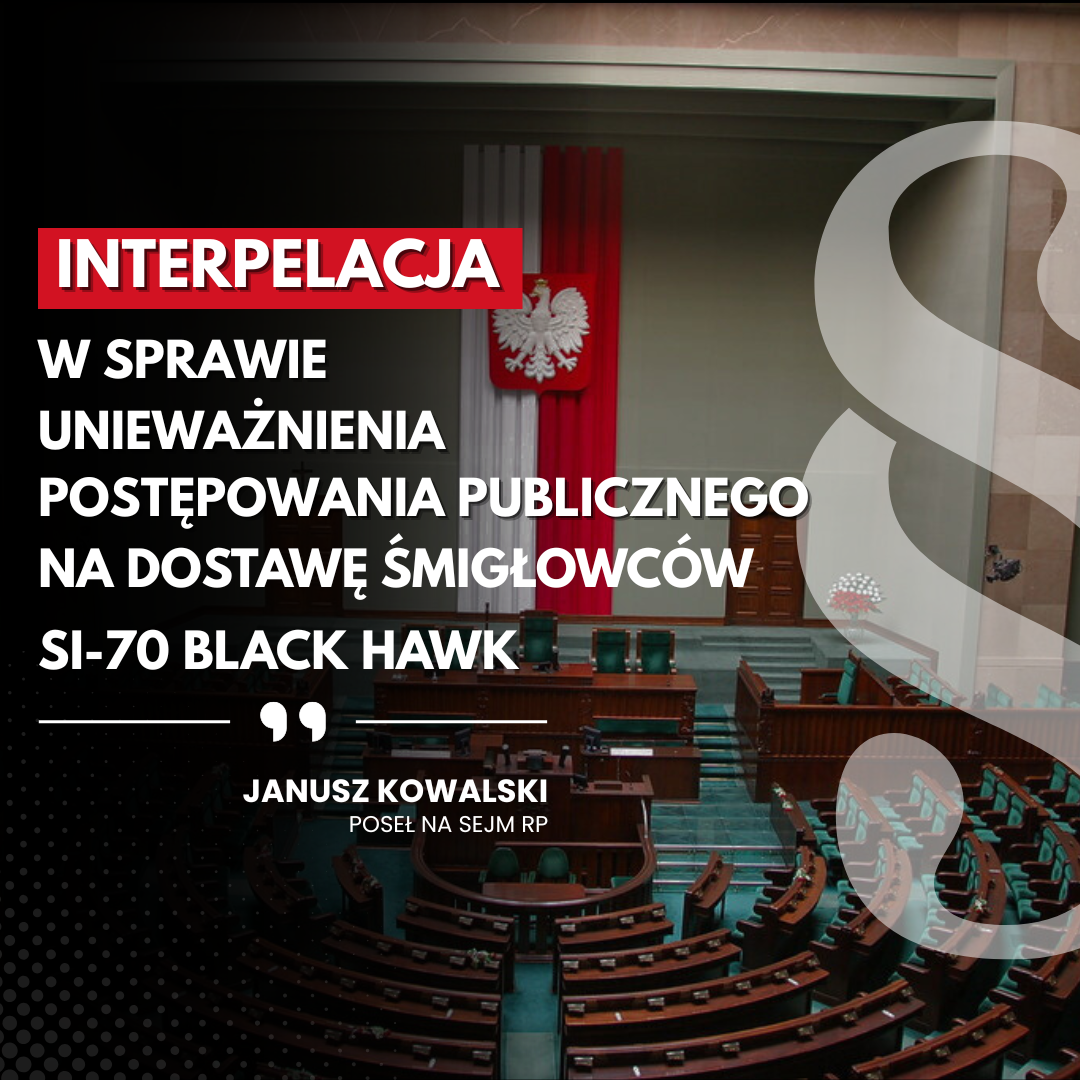 Interpelacja złożona przez grupę posłów, w tym posła Janusza Kowalskiego, z dnia 23 czerwca 2025 roku w sprawie decyzji Agencji Uzbrojenia o unieważnieniu postępowania publicznego na dostawę wielozadaniowych śmigłowców wsparcia S-70i Black Hawk, produkowanych w Polskich Zakładach Lotniczych sp. z o.o. w Mielcu.