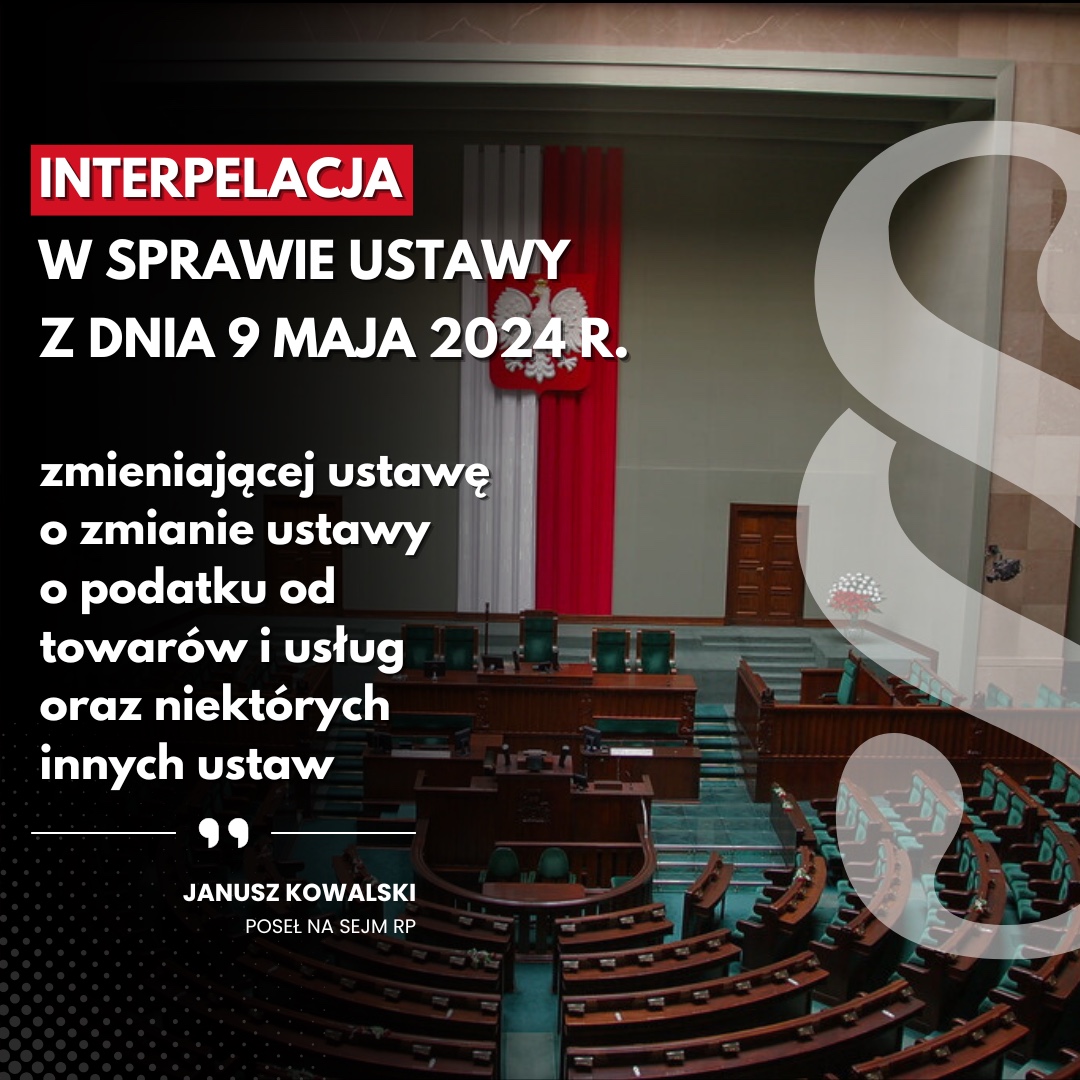 Interpelacja posła Janusza Kowalskiego z dnia 18 września 2024 roku w sprawie ustawy z dnia 9 maja 2024 r. zmieniającej ustawę o zmianie ustawy o podatku od towarów i usług oraz niektórych innych ustaw