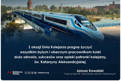 Z okazji ogólnopolskiego Dnia Kolejarza, pragnę życzyć wszystkim byłym i obecnym pracownikom kolei dużo zdrowia, sukcesów w życiu prywatnym i zawodowym oraz opieki patronki kolejarzy, św. Katarzyny Aleksandryjskiej. Ten dzień to również okazja do podziękowania dla wszystkich osób, które przyczyniły się do intensywnego rozwoju polskiego kolejnictwa w ostatnich latach.
