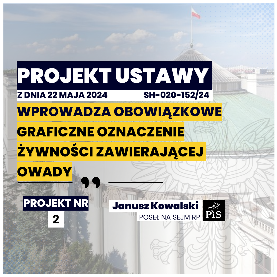 22 maja 2024 r. Klub Parlamentarny Prawa i Sprawiedliwości i Koła Poselskiego Kukiz 15 z inicjatywy posła Janusza Kowalskiego złożył w Sejmie projekt ustawy o zmianie ustawy o jakości handlowej artykułów rolno-spożywczych.