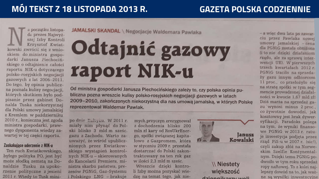 W każdym normalnym państwie ujawnienie niezbitych dowodów na jawne działanie rządu na rzecz gospodarczych i politycznych interesów innego kraju doprowadziłoby do natychmiastowej zmiany władz. Niestety, większość dziennikarzy woli eksploatować kompletnie nieistotne tematy, zamiast zadawać premierowi i ministrom pytania po ujawnieniu raportu NIK, np. dotyczące umorzenia Gazpromowi zaległości płatniczych w kwocie ponad miliarda złotych czy przepłacania przez Polskę od 2010 r. za drogi rosyjski gaz. Nikt nie pyta premiera, dlaczego głównym negocjatorem umowy gazowej w latach 2009–2010 ze strony PGNiG był wiceprezes spółki Radosław Dudziński, który w 2003 r. – jako dyrektor biura strategii – był współodpowiedzialny za podpisanie przez rząd SLD aneksu do umowy jamalskiej, będącego praprzyczyną trwających od 11 lat polskich problemów z tym kontraktem.
