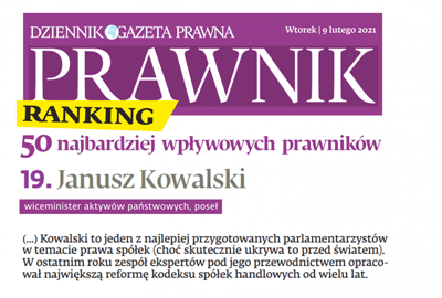 Ranking 50 najbardziej wpływowych prawników według Dziennik Gazeta Prawna: Janusz Kowalski na 19 miejscu