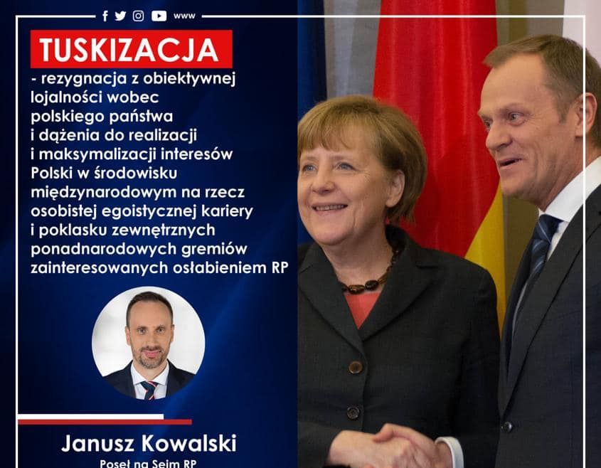 TUSKIZACJA – rezygnacja z obiektywnej lojalności wobec polskiego państwa i dążenia do realizacji i maksymalizacji interesów Polski w środowisku międzynarodowym na rzecz osobistej, egoistycznej kariery i poklasku zewnętrznych, ponadnarodowych gremiów zainteresowanych osłabieniem RP!