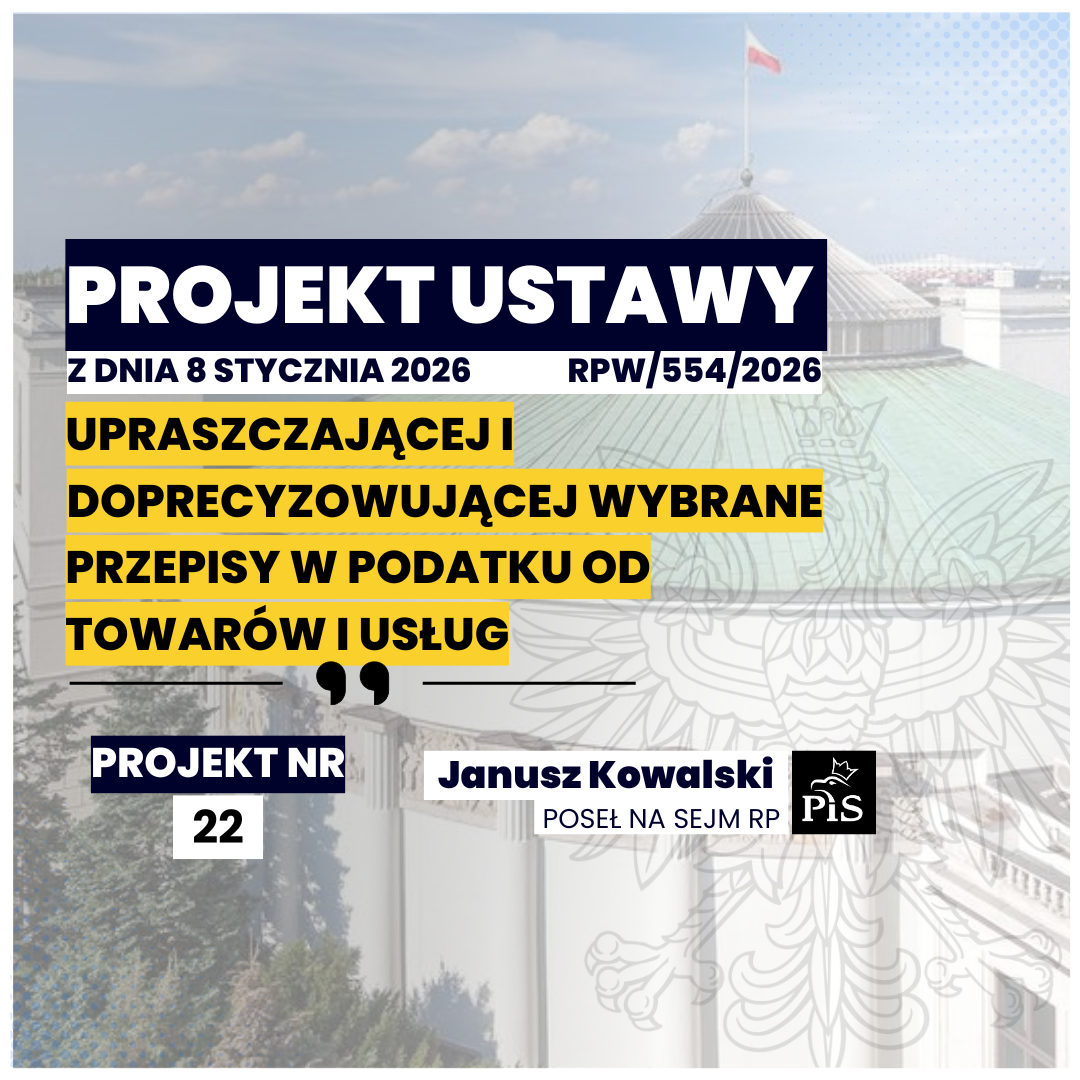 8 stycznia 2026 r. Klub Parlamentarny Prawa i Sprawiedliwości z inicjatywy posła Janusza Kowalskiego złożył w Sejmie projekt ustawy o zmianie ustawy o podatku od towarów i usług.