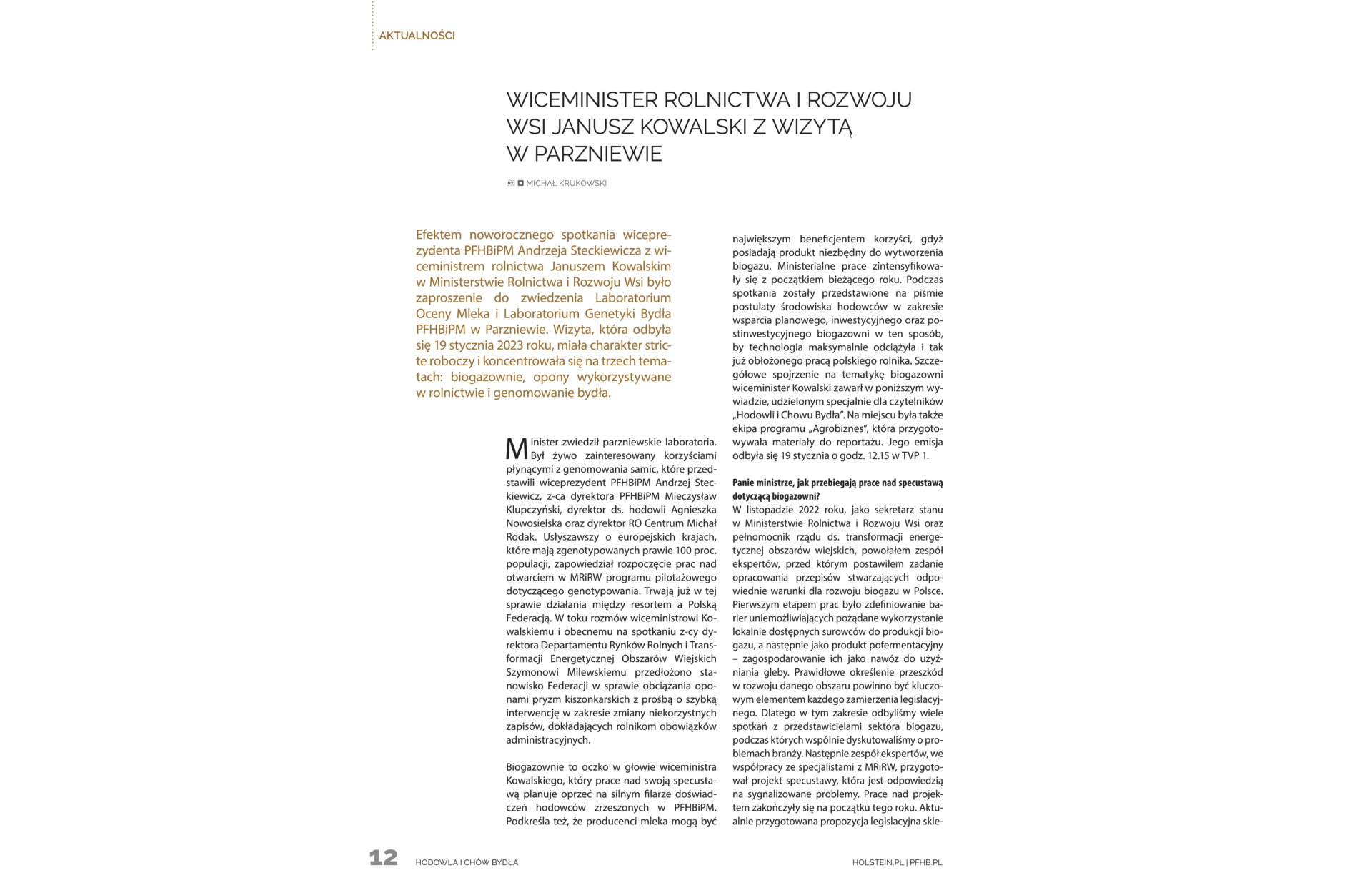 Efektem noworocznego spotkania wiceprezydenta PFHBiPM Andrzeja Steckiewicza z wiceministrem rolnictwa Januszem Kowalskim w Ministerstwie Rolnictwa i Rozwoju Wsi było zaproszenie do zwiedzenia Laboratorium Oceny Mleka i Laboratorium Genetyki Bydła PFHBiPM w Parzniewie. Wizyta, która odbyła się 19 stycznia 2023 roku, miała charakter stricte roboczy i koncentrowała się na trzech tematach: biogazownie, opony wykorzystywane w rolnictwie i genomowanie bydła.