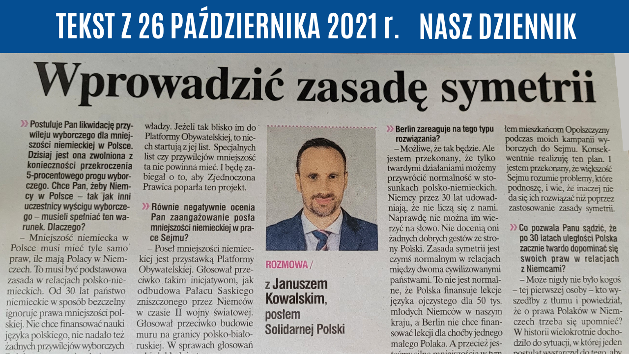 Janusz Kowalski: Mniejszość niemiecka w Polsce musi mieć tyle samo praw, ile mają Polacy w Niemczech. To musi być podstawowa zasada w relacjach polsko-niemieckich. Od 30 lat państwo niemieckie w sposób bezczelny ignoruje prawa mniejszości polskiej. Nie chce finansować nauki języka polskiego, nie nadało też żadnych przywilejów wyborczych Polakom tam mieszkającym. Nie zwrócono Związkowi Polaków w Niemczech zagrabionych w czasach rządów Hitlera nieruchomości. Skoro my robimy wszystko, aby wywiązać się z naszych obowiązków wypływających z umów międzynarodowych, a Niemcy je świadomie ignorują, to powinniśmy zacząć stosować zasadę symetrii.