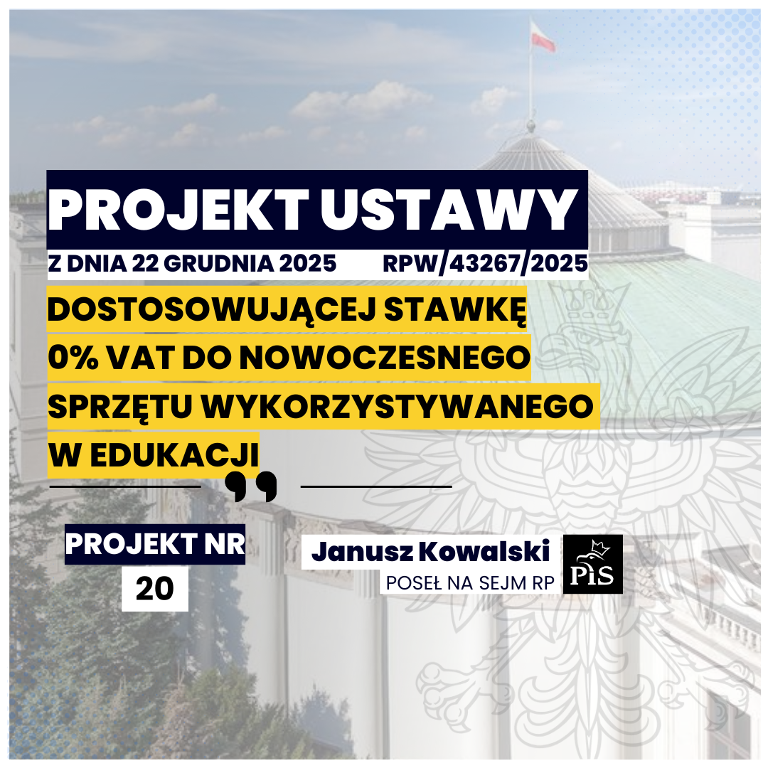 22 grudnia 2025 r. Klub Parlamentarny Prawa i Sprawiedliwości z inicjatywy posła Janusza Kowalskiego złożył w Sejmie projekt ustawy o zmianie ustawy o podatku od towarów i usług.